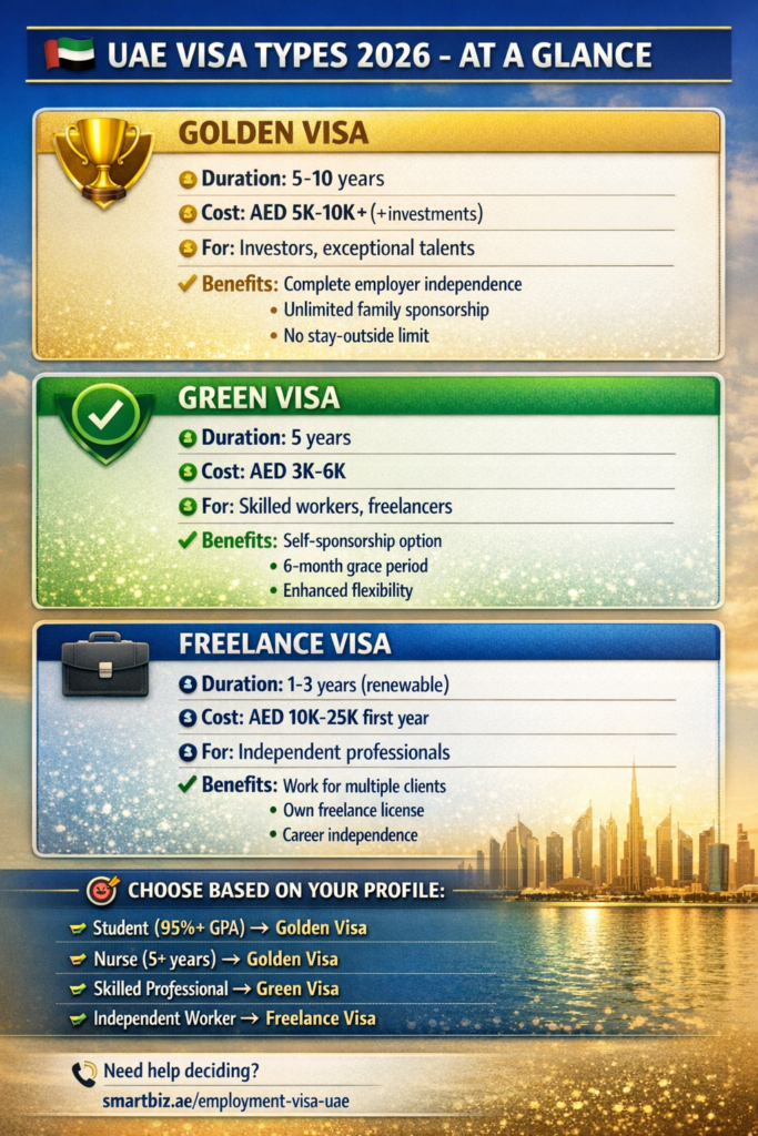 While Golden Visa receives significant attention, understanding what is green visa UAE 2026 is equally important as it serves different residency needs with its own advantages.