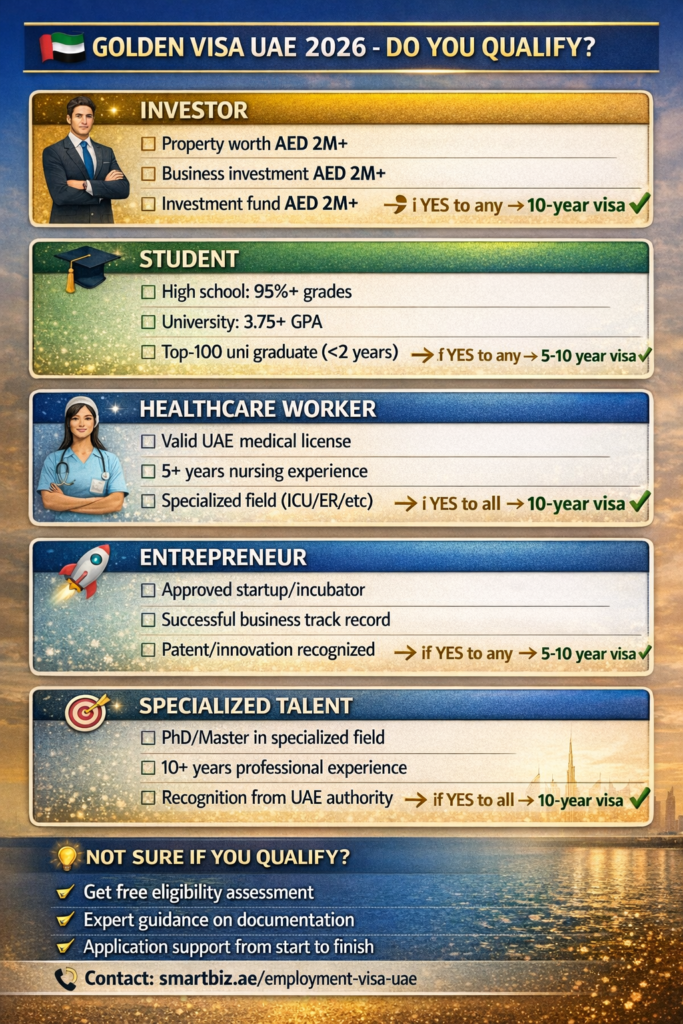 Who Is It Designed For: The UAE golden visa eligibility 2026 encompasses diverse categories recognizing various forms of excellence and contribution. Investors who meet minimum investment thresholds in real estate, businesses, or investment funds qualify for 10-year visas. Entrepreneurs with successful or innovative business ventures receive recognition through Golden Visa eligibility.